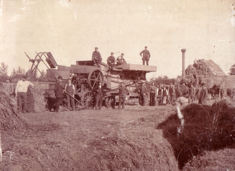 Links achterin de dorsmachine waarmee Boterman in het oogstseizoen loonwerk verricht.