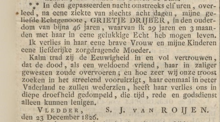Na een ziekte van acht dagen overlijdt Grietje op 22 december 1826. In de kerk van Vledder is het graf van Grietje te vinden, ze wordt slechts 45 jaar.
