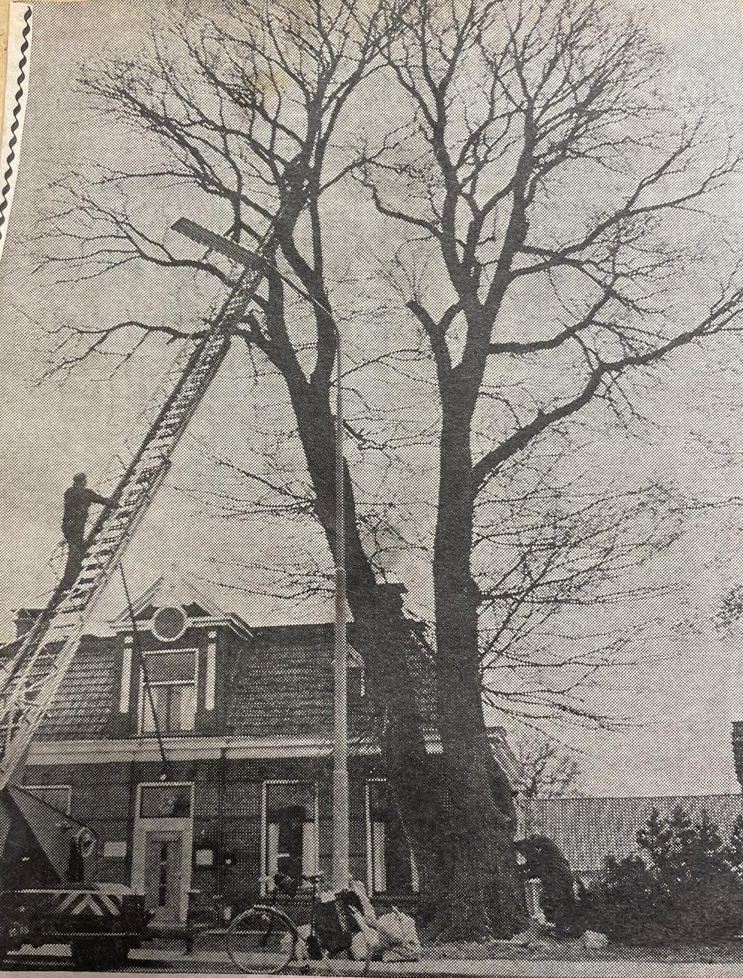 In de krant valt te lezen “De enkele honderden jaren oude veld-iep tegenover het gemeentehuis in Vledder is vanaf vorige week dinsdag enkele dagen toevertrouwd geweest aan de goede zorgen van twee boomchirurgen van de gebroeders Copijn uit het Utrechtse Groenekan. Het bijzondere exemplaar begon een aantal duidelijke ouderdomsverschijnselen te vertonen en vooral na de novemberstorm van vorig jaar raakte de reus behoorlijk in verval. Voor de gemeente Vledder was dat de reden om de hulp in te roepen van Staatsbosbeheer, waarna de boomchirurgen werden ingeschakeld. “